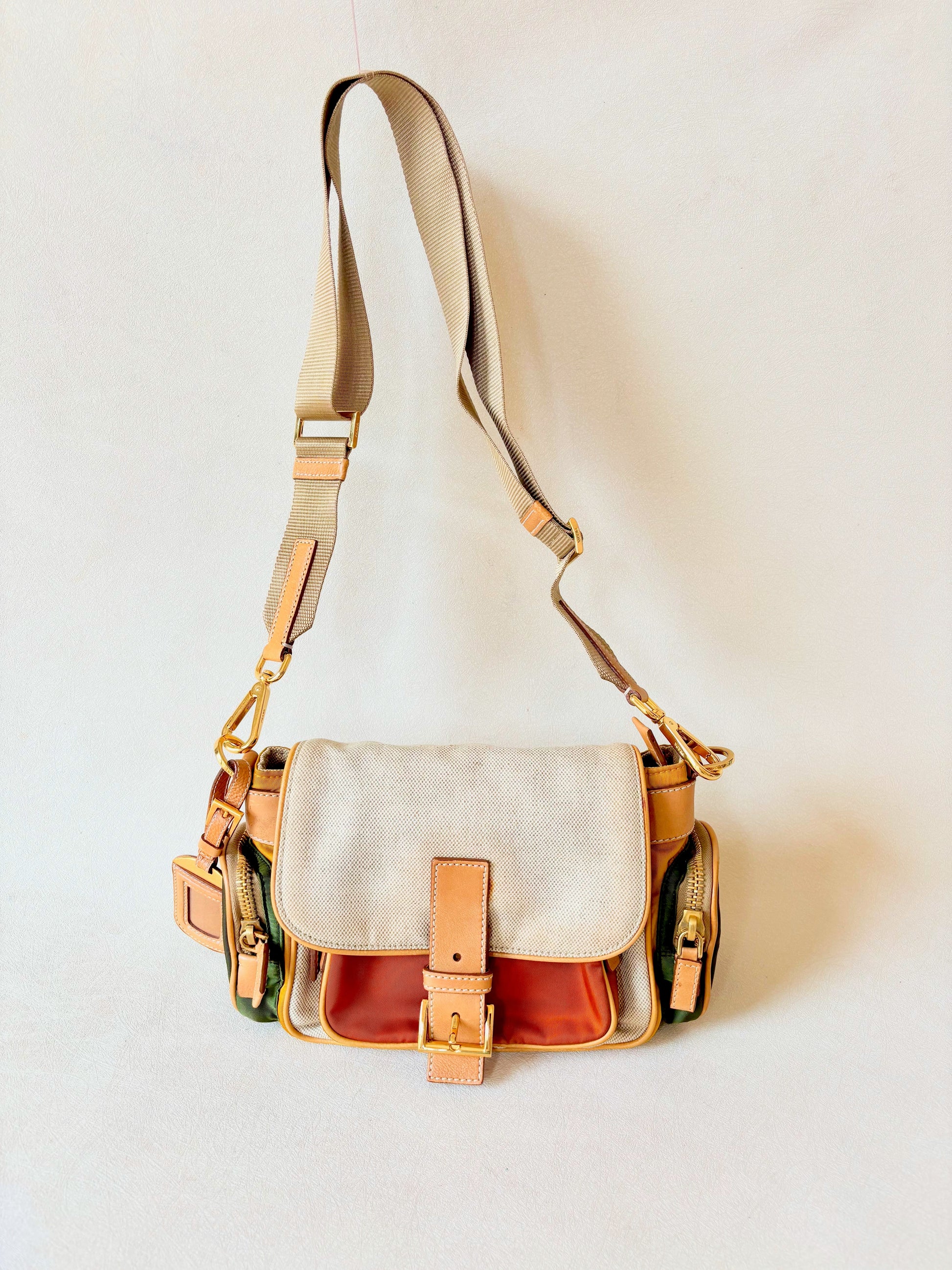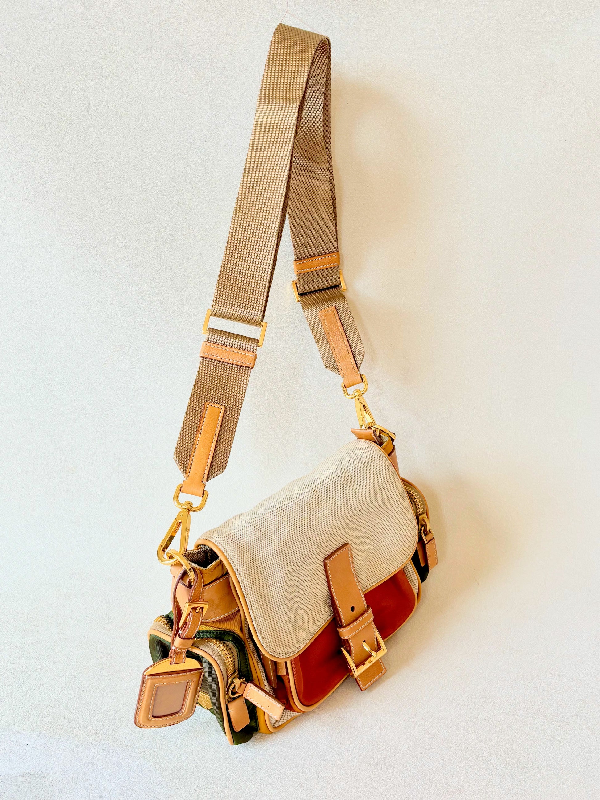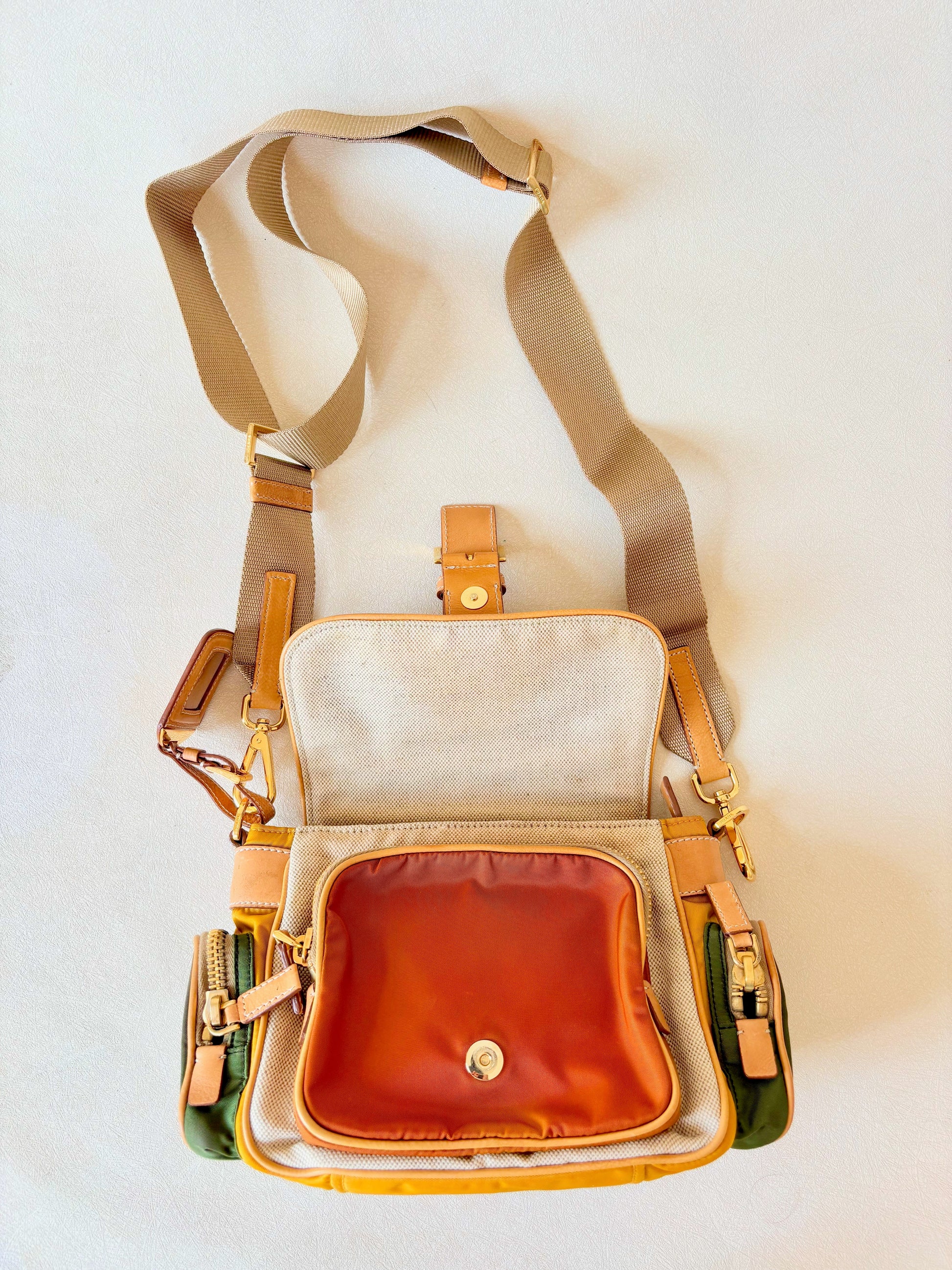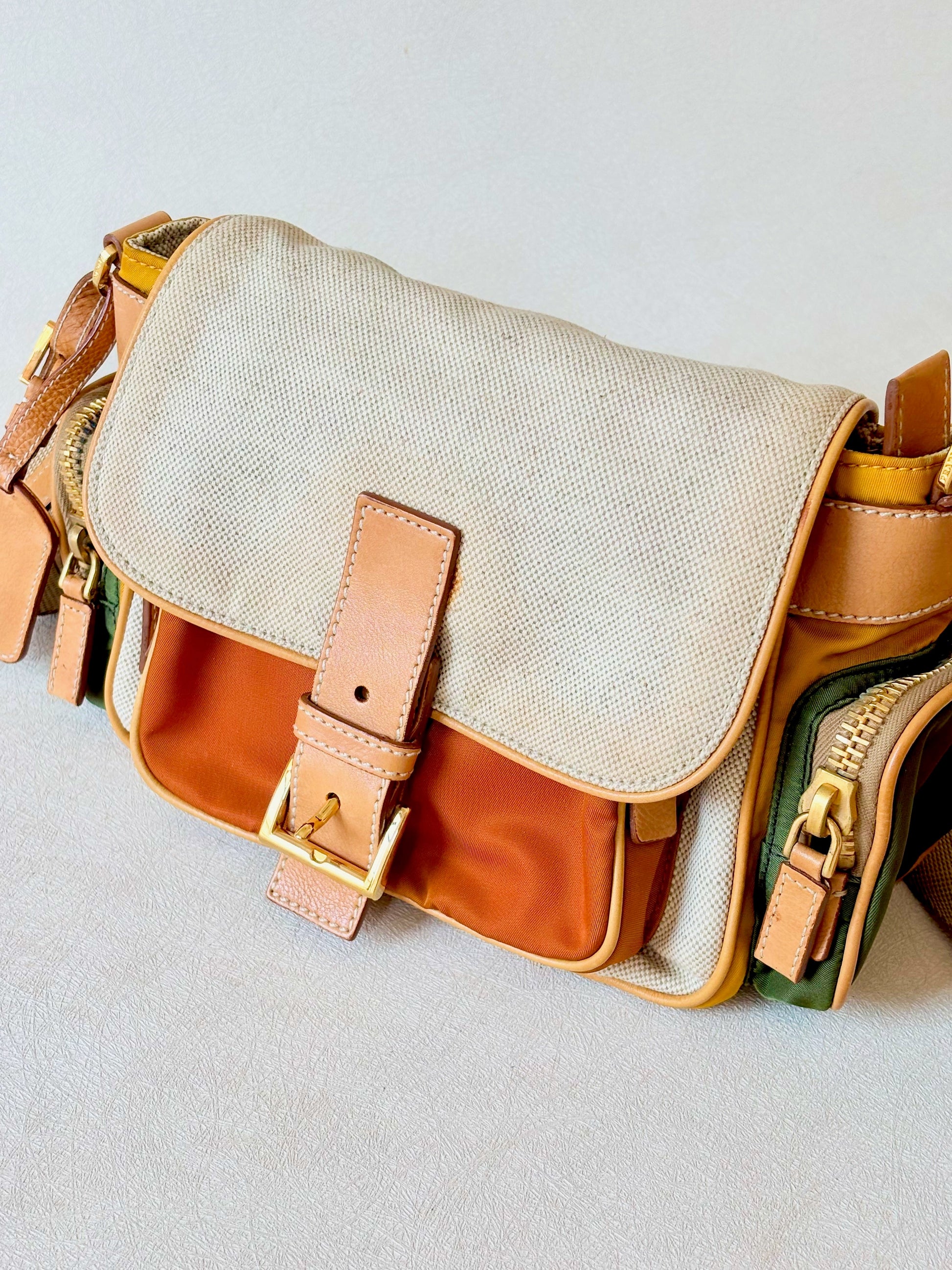 * En cuir camel, toile de coton écrue et toile de nylon cuivre, jaune et vert kaki pour les poches